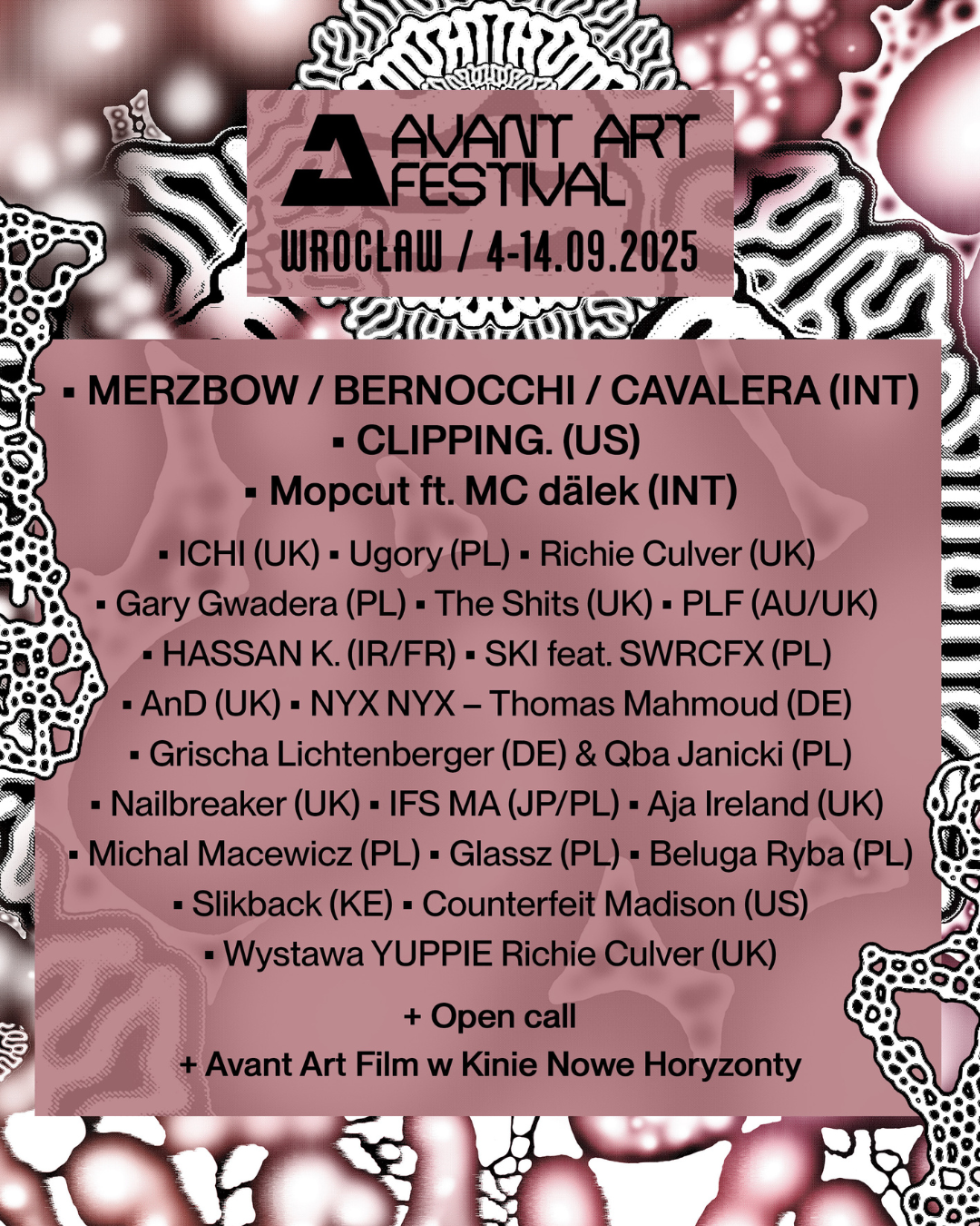 This year’s edition, taking place in Wrocław from September 4 to 14, carries the motto “more courage, more risk” and emphasizes the DIY spirit, punk energy, and the search for new artistic languages. The program features performances by artists from around the world, including Merzbow, Bernocchi and Iggor Cavalera, Clipping., Slikback, Mopcut feat. Dälek, as well as Polish projects such as Ugory, SKI feat. SWRCFX, and beluga ryba.